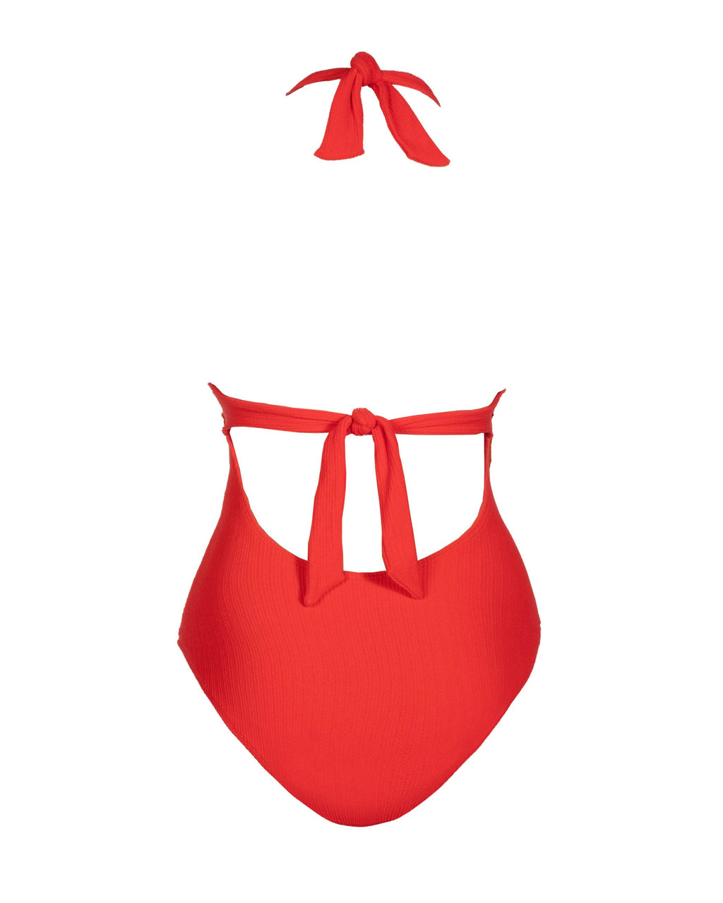 Our Gabrielle One Piece is a halter-style swimsuit with a chic ring trim at the center front. Adjustable ties at the neck and back let you customize the fit, while the scoop back adds a touch of allure with comfortable side coverage. An under-bust band provides natural lift and support, and tummy control with flattering shirring at the torso ensures a smooth, confident fit. The perfect mix of sophistication and sexiness, it’s made for sun-soaked getaways and stylish escapes.